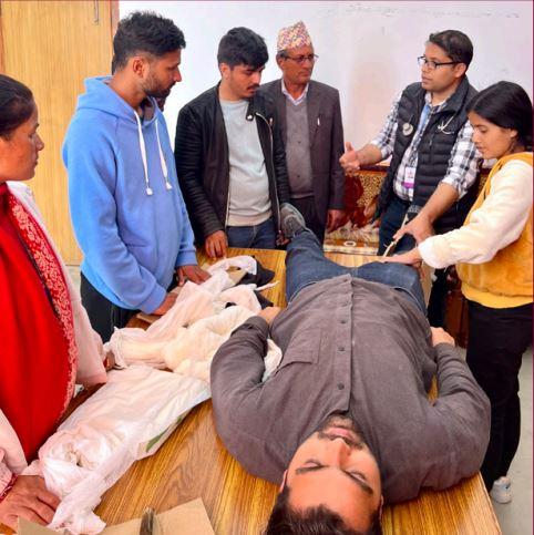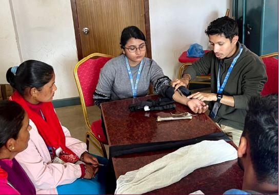 These CHRs (teachers, police, officers, drivers and local leaders) are the first to arrive during emergencies long before professional medical help is available. In 2023 35 CHRs from one of Achham’s most underserved municipalities were trained using an adapted WHO Basic Emergency Care curriculum. Hands-on sessions taught practical life saving techniques like fracture immobilization and chest wound care.